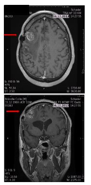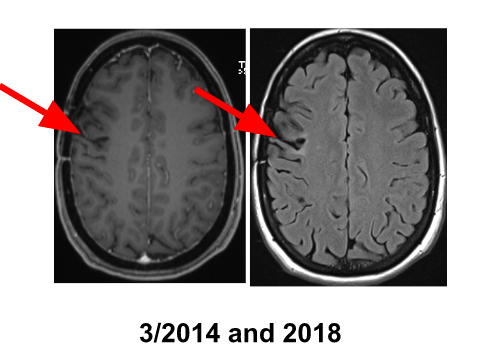 Beginn day 9, resolved day 40 after alpha-therapy: Moderate brachiofacial hemiparesis L, completely resolved, No permanent deficit!